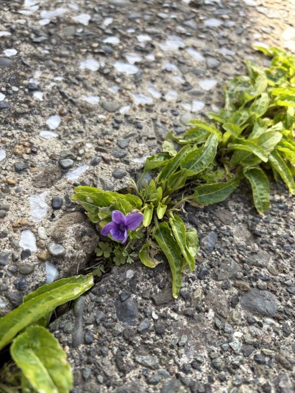 お昼休みに事務所の外で小さな可愛らしい物を発見… 地面の隙間からスミレが咲いていました😊 春に咲くス…