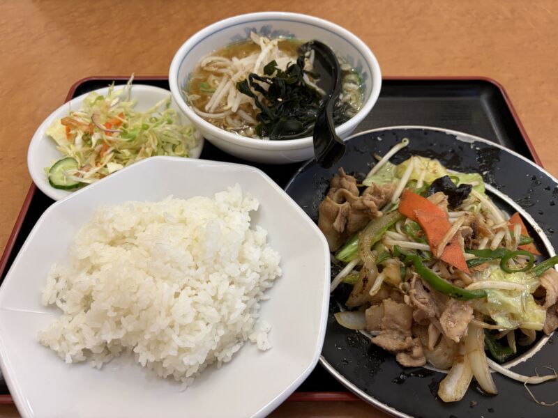 かなりお腹すいてた私は欲張って肉野菜炒め定食に半ラーメンを注文。